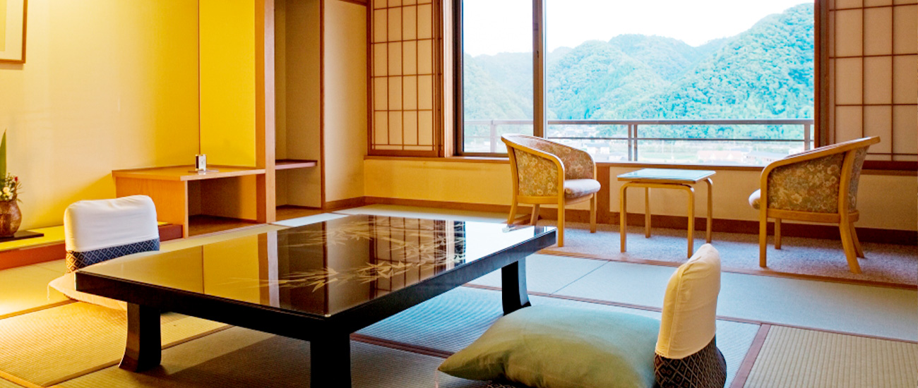 美作の山の幸・海の幸に心をこめて。豊かな自然に恵まれた 美作湯郷の土地ならではの味をお楽しみください。 料理人の心を込めた味覚の逸品を心ゆくまでご堪能いただけます。 天然温泉露天風呂付客室から、14畳の広々としたお部屋まで。 のどかな湯郷の町並みや、ゆったりとした山々が見渡せる眺望を お楽しみください。 湯郷温泉 やさしさの宿 竹亭